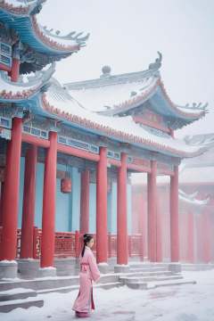 1 beautiful girl,,chinese architecture, Pink, white, light blue building with red columns and cornices, chinese tradition architecture,snowing,  <lora:Joi Qiao:0.6><lora:blindbox_v1_mix:1.0>