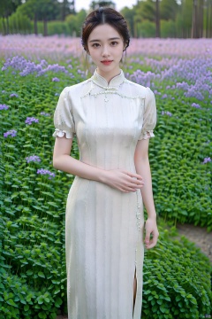 1girl,outdoor,looking_at_viewer,side_blunt_bangs,china_dress,chinese_style,big breasts,pose,solo,1girl,black hair,black eyes, , cheongsam
