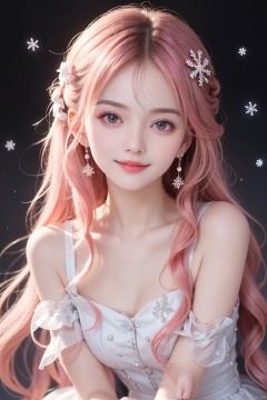 ((highest quality, master works, ultra-fine section, light and shadow tracking, ultra-high resolution)) a girl,bow smile,simple background,gradient background,snowflakes,particle light,real light and shadow,pink hair,happy,shy,blush,bright scene,colorful details,