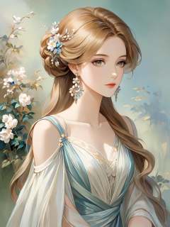 Portrait painting in an impressionist style, capturing a woman's upper body. She is depicted wearing a flowing, light-colored gown with shoulder straps that gently cascade down. The painting should exhibit the rich textures and layered brushwork characteristic of oil on canvas. The woman's adornments include delicate, flower-shaped earrings and elongated, ornate tassels, lending an air of elegance and sophistication. Her expression is serene, with a soft, thoughtful gaze directed away from the viewer, evoking a sense of introspection. Her hairstyle is uncomplicated yet graceful, complementing the overall softness of the painting. The background is a blend of muted, harmonious tones, emphasizing the figure in a classic portrait composition, full frame