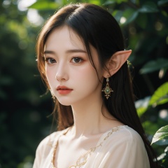 elf portrait,enchanting beauty,fantasy,ethereal glow,pointed ears,delicate facial features,long elegant hair,nature-themed attire,mystical ambiance,soft lighting,tranquil expression,harmonious with nature,subtle magical elements,serene,intricate jewelry,dreamlike quality,pastel colors,