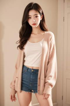 1girl,solo,light brown hair,blush,shirt,white shirt,orange cardigan,cardigan,collarbone,cropped legs,long sleeves,sleeves past wrists,cowboy shot,