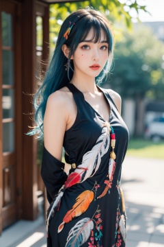 (full body:1.3),(realistic:1.4),(Photo-referencing),HDR,(Studio Lighting),Soft Lighting,(Accent Lighting:1.21),(colorful:1.3),(outdoors:1.33),(arms behind back:1.4),1girl,solo,(blue hair:1.33),long sleeves,looking at viewer,bangs,(long hair:1.2),closed mouth,yellow eyes,hair between eyes,multicolored eyes,purple eyes,sidelocks,high ponytail,straight hair,swept bangs,<lora:ColorfulFeatherPortrait-极氪写实MAX:0.65>,1girl,bare shoulders,blonde hair,(colorfulfeatherportrait:1.3),facepaint,feather hair ornament,feathers,hair ornament,lips,long hair,makeup,mascara,portrait,realistic,solo,upper body,