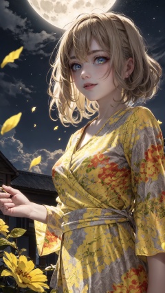 tutututu,floral print,dress,yellow flower dress,long sleeves,obi,<lora:yellow_dress_V2-000006:0.65>,masterpiece, best quality,1girl, (colorful),(finely detailed beautiful eyes and detailed face),cinematic lighting,bust shot,extremely detailed CG unity 8k wallpaper,white hair,solo,smile,((flying petal)),(Flowery meadow)sky, cloudy_sky, building, moonlight, moon, night, (dark theme:1.3), light, fantasy,