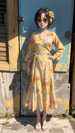 tutututu,dress,yellow flower dress,long sleeves,obi,<lora:yellow_dress_V2-000006:0.65>,dj cat ,turquoise hair,  black sunglasses , full body , headphones