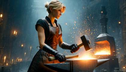 Photograph of  disney animation, blacksmithcute girl forges armour,  working in a huge forge. in paw big fantasy (hammer:1.6), Dressed in (leather trousers:1.3) and (blacksmith's apron:1.3), thick black leather gloves, heated iron laid on magical (an anvil:1.9). short blonde hair, Lots of sparks, hot, looking at viewer, short hair, (masterpiece), (best quality:1.2), intricate details, (highly detailed skin:1.2),intricate details, 8k post production, high resolution, hyper detailed, trending on artstation, sharp focus, studio photo, intricate details, highly detailed,  , captured on a (Hasselblad X1D II 50C)