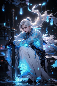 ((best quality)), ((masterpiece)), ((ultra-detailed)), extremely detailed CG, (illustration), ((detailed light)), (an extremely delicate and beautiful), a girl, solo, ((upper body, )), ((cute face)), expressionless, (beautiful detailed eyes), full breasts, (medium breasts:1.2), blue dragon eyes, (Vertical pupil:1.2), white hair, shiny hair, colored inner hair, [Armor_dress], athletic posture, kimono, ((White clothes, long skirt)), (Drifting with the wind: 1.5).((Holding weapons, swords, blades, hilts, scabbard, out scabbards)).(Motion Blur: 1.2), (Depth of Field: 1.2, (Ray Tracing Lighting: 1.2).(Surrounded by blue flames) (Blue clouds and mist)(Black background), ((High contrast) (Bright)), swordsman, guijian,<lora:EMS-254762-EMS:0.300000>,<lora:EMS-280798-EMS:0.100000>,<lora:EMS-88528-EMS:0.400000>