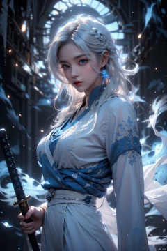((best quality)), ((masterpiece)), ((ultra-detailed)), extremely detailed CG, (illustration), ((detailed light)), (an extremely delicate and beautiful), a girl, solo, ((upper body, )), ((cute face)), expressionless, (beautiful detailed eyes), full breasts, (medium breasts:1.2), blue dragon eyes, (Vertical pupil:1.2), white hair, shiny hair, colored inner hair, [Armor_dress], athletic posture, kimono, ((White clothes, long skirt)), (Drifting with the wind: 1.5).((Holding weapons, swords, blades, hilts, scabbard, out scabbards)).(Motion Blur: 1.2), (Depth of Field: 1.2, (Ray Tracing Lighting: 1.2).(Surrounded by blue flames) (Blue clouds and mist)(Black background), ((High contrast) (Bright)), swordsman, guijian,<lora:EMS-88528-EMS:0.400000>,<lora:EMS-254762-EMS:0.300000>,<lora:EMS-280798-EMS:0.100000>