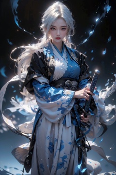 ((best quality)), ((masterpiece)), ((ultra-detailed)), extremely detailed CG, (illustration), ((detailed light)), (an extremely delicate and beautiful), a girl, solo, ((upper body, )), ((cute face)), expressionless, (beautiful detailed eyes), full breasts, (medium breasts:1.2), blue dragon eyes, (Vertical pupil:1.2), white hair, shiny hair, colored inner hair, [Armor_dress], athletic posture, kimono, ((White clothes, long skirt)), (Drifting with the wind).((Holding weapons, swords, blades, hilts, scabbard, out scabbards)).(Motion Blur: 1.2), (Depth of Field: 1.2, (Ray Tracing Lighting: 1.2).(Blue flame:1.5).(Black background), ((High contrast) (Bright)), swordsman,<lora:EMS-254762-EMS:0.500000>,<lora:EMS-280798-EMS:0.200000>,<lora:EMS-7412-EMS:0.100000>
