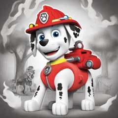 dog marshal in the fire , burning tree, coloring page, black and white color only,(coloring book),( sketchbook), firetruck in the background, free lines, on paper, A blend of comic book art and lineart full ,masterpiece, high-resolution,greyscale acrylic painting, low res, low resolution,<lora:sdxl_lora_marshal_paw_patrol:1>