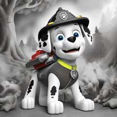 dog marshal in the fire , burning tree, (( black and white color only)),(coloring book),( sketchbook), firetruck in the background, free lines, on paper, A blend of comic book art and lineart full ,masterpiece, high-resolution,greyscale acrylic painting, low res, low resolution,<lora:sdxl_lora_marshal_paw_patrol:1>