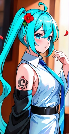 (masterpiece),  (best quality),  loli,  1girl, solo, twintails, long hair, hatsune miku, detached sleeves, shirt, necktie, bangs, looking at viewer, sleeveless, sleeveless shirt, upper body, hair between eyes, blue eyes, blush, petals, very long hair, collared shirt, long sleeves, blue hair, bare shoulders, hair ornament, parted lips, black sleeves, blurry, looking to the side, wide sleeves, hand up, ahoge, from side, blurry background, tattoo, grey shirt, white shirt, blue necktie,<lora:EMS-280663-EMS:0.800000>