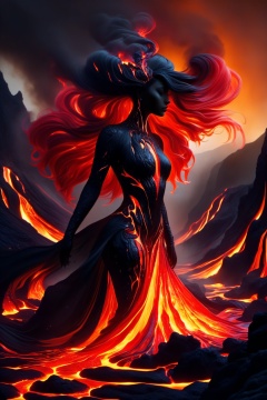 Dark fantasy surrealism :: ominous Inhuman Goddess made of molten lava :: cracks in the skin revealing a fiery glow,  it looks rough and uneven,  hard and brittle,  her body is made of black rock with glowing red cracks :: her hair is like a stream of liquid lava,  flowing down the back and dripping to the ground,  molten_liquid_lava_hair dripping down :: she is crouching on a rocky surface,  emerging from a volcanic eruption ::  rocky landscape with a fiery sky,  lava flows and smoke,  warm colors :: fiery and intense mood,  dark and ominous mood :: lit from below,  creating a sense of drama and intensity,  illuminated by the fire and the smoke :: dynamic and powerful composition,  imposing :: high level of detail,  focus on the figure,  background out of focus,  epic dof :: fantasy art,  gothic art,  cgsociety :: lava and fire goddess made of black rock and flames, Decora_SWstyle, ral-lava,<lora:EMS-32082-EMS:0.700000>,<lora:EMS-261918-EMS:0.800000>,<lora:EMS-90474-EMS:0.700000>