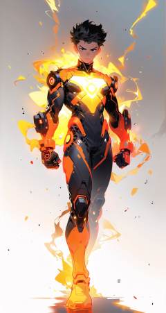 asuo,1boy,male focus,solo,bodysuit,full body,looking at viewer,white background,wind,electricity,black hair,glowing,black bodysuit,clenched hands,spiked hair,standing,simple background,short hair,gloves,<lora:asuo-000014:0.8>,