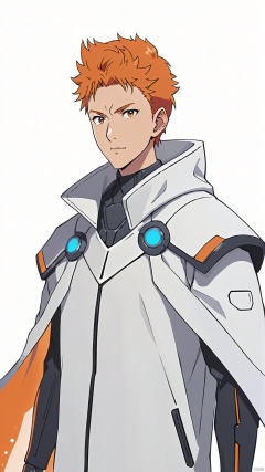(National style cyber-future style: 1.5) Large half-body (character's facial details: 1.5) (Minimum thick paint: 1.5) 20 years old man, wearing a national style futuristic white mechanical cloak, orange hair, texture smooth like a dreamy nebula, silhouette illustration flowing behind him