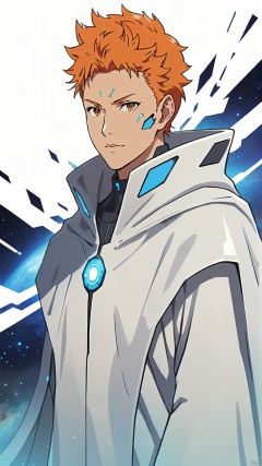 (National style cyber-future style: 1.5) (Detail of figure's face: 1.5) (Minimum thick paint: 1.5) 20 year old man, wearing a supernatural energy National style cyber-future white mechanical cape, orange hair, texture smooth like a dreamy nebula, (silhouette illustration on flowing background)