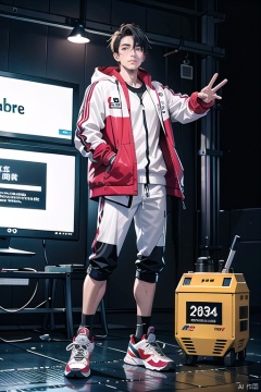 Sakuragi Hanamichi in Slam Dunk, red and yellow, robotic arms, wearing frosted milky white jackets, looking at viewer, happy pose, full body, black background centered, fine luster, clay materials, Garage Kit, cyberpunk, IP by pop mart, mockup blind box, Edge light, front view, octane render, blender, hyper quality, Ultra HD, 8K