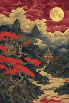 hhongj,no humans,tree,moon,cloud,scenery,architecture,east asian architecture,sky,mountain,outdoors,full moon,cloudy sky,leaf,pagoda,<lora:heijin-000008:0.8>,