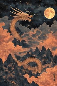 hhongj, moon, no humans, dragon, sky, full moon, night, eastern dragon, star \(sky\), cloud, smoke, mountain, fire, claws, night sky, horns, outdoors, starry sky, scales, signature,<lora:heijin-000008:0.8>,