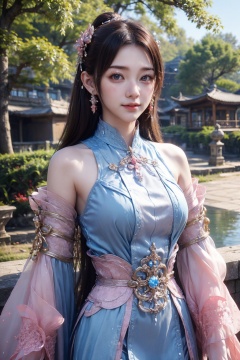 1girl,solo,pink,long hair,hair ornament,looking at viewer,detached sleeves,outdoors,