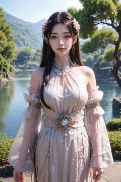 1girl,solo,pink,long hair,hair ornament,looking at viewer,detached sleeves,outdoors,(see-through:1.5),