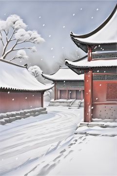 ycbh, snow, tree, outdoors, bare tree, scenery, sky, snowing, east asian architecture, no humans, solo, traditional media, architecture,<lora:ycbh4:0.8>,