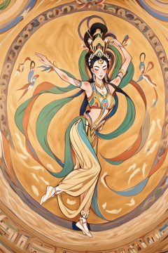 ycbh, 1girl, dancing, black hair, solo, hair ornament, dress, barefoot, long hair, Rock color panel painting, matte texture, a classical beauty, Flying Dunhuang, Flying Dunhuang dancer,<lora:ycbh4:0.8>,