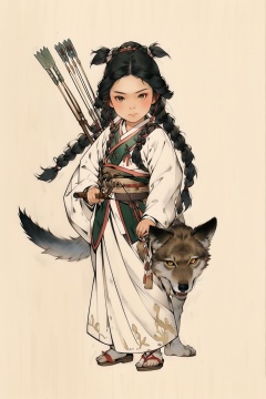 ycbh, 1girl, weapon, arrow \(projectile\), bow \(weapon\), braid, holding, holding weapon, twin braids, black hair, simple background, holding bow \(weapon\), long sleeves, standing, full body, solo, traditional clothes, long hair, animal, child, wolf,<lora:ycbh4:0.8>,