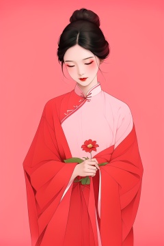 ycbh, 1girl, solo, flower, black hair, holding flower, holding, chinese clothes, simple background, closed eyes, hair bun, long sleeves, shawl, pink background, red lips, closed mouth, single hair bun, hanfu, pink flower, upper body, makeup,<lora:ycbh4:0.8>,