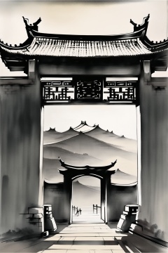 ycbh, scenery, solo, outdoors, architecture, traditional media, sky, Ink wash, minimalist style, distant view, city gate, beyond the Great Wall, best quality, 32K, HD,<lora:ycbh4:0.8>,