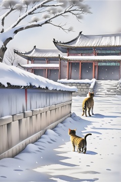 ycbh, snow, no humans, outdoors, tree, winter, cat, snowing, bare tree, day, animal, east asian architecture, animal focus, scenery, traditional media, architecture,<lora:ycbh4:0.8>,