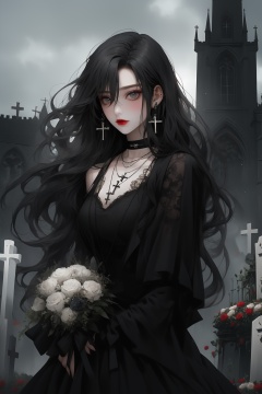 ShenMi, 1girl, black hair, jewelry, flower, cross, earrings, long hair, holding, bouquet, looking at viewer, white flower, rose, necklace, white rose, holding bouquet, dress, black dress, grey eyes, red lips, solo focus, graveyard, outdoors, church, hair between eyes, holding flower, makeup, tombstone, cross necklace, solo, long sleeves, gothic style <lora:ShenMi7:0.8>