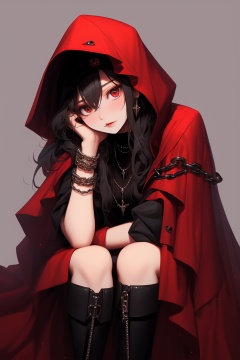 ShenMi, 1girl, long hair, red eyes, jewelry, solo, sitting, black hair, hood, earrings, hand on own face, looking at viewer, hand on own cheek, head rest, boots, hood up, cloak, necklace, skull, chain, head tilt, hair between eyes, red cloak, closed mouth, bracelet, black footwear, pendant, belt, hooded cloak, black pants, hand between legs, buckle, gothic style<lora:ShenMi7:0.8>