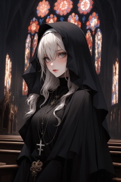 ShenMi,Colored glass,interior,statue,Gothic architecture,church interior,religious color,artistic beauty,cool tone,gray,blue,glass window,mysterious,solemn,1 girl,long hair,solo,looking at the audience,gray eyes,hair accessories,stairs,necklace,white hair,shirt,jewelry,hair between eyes,white shirt,bangs,black necklace,wavy hair,necklace,closed,long sleeves,nun,<lora:ShenMi7:0.8>,