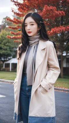 From a style perspective, the image has a classic and timeless quality to it, with the subject's outfit and pose reminiscent of vintage photographs. The subject's outfit, a coat and scarf, is simple yet elegant, allowing the focus to remain on the subject and the surrounding environment.