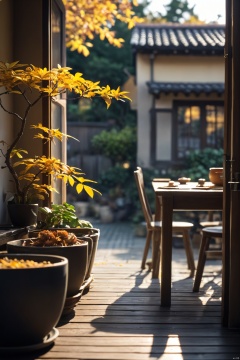 ((nobody)), countryside, autumn, fallen leaves, yellow leaves, landscape, indoor, (kitchen), house, door, window, yard, table and chairs, bowls and chopsticks, dish, outdoor, plant, potted plant, tree, flowerpot, miyazaki style,bokeh