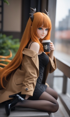 (masterpiece),(highest quality),highres,(extremely detailed),figure,1girl,dragon horns,dragon wings,dragon tail,dragon girl,pantyhose,solo,long hair,sitting,smile,looking at viewer,tail,black legwear,high heels,blue eyes,crossed legs,blush,bangs,off shoulder,black footwear,long sleeves,brown hair,bare shoulders,blurry,black shirt,shirt,closed mouth,brown shirt,wings,outdoors,blurry background,orange hair,blunt bangs,sleeveless,brown dress,jacket,from side,brown coat,brown jacket,window,sleeveless shirt,dress,very long hair,depth of field,shoes,disposable cup,coffee cup,coat,feet out of frame,depth of field,blurry foreground,blurry background,