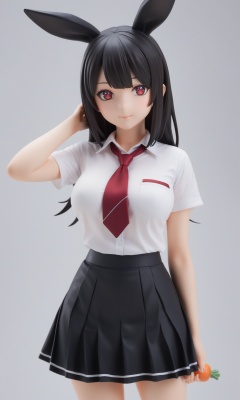 reisen udongein inaba,1girl,solo,red_necktie,carrot,looking_at_viewer,rabbit girl,breasts,arm_behind_head,short_sleeves,white_shirt,skirt,star-shaped_pupils,symbol-shaped_pupils,. gorgeous,key visual,vibrant,studio anime,award-winning,professional,highly detailed,high budget,cinemascope,