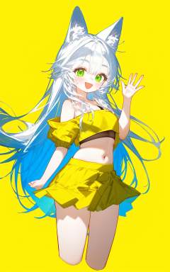 1girl,solo,green eyes,smile,:d,long hair,white hair,animal ears,animal ear fluff,eyebrows visible through hair,medium breasts,navel,bare shoulders,yellow jacket,off shoulder,crop top,midriff,yellow skirt,hand up,waving,cropped legs,simple background,blue background,best quality,amazing quality,very aesthetic,absurdres,