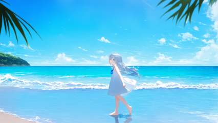 outdoors, blue sky, ocean, waves, beach, 1girl, solo, long hair, hair between eyes, silver hair, blue eyes, parted lips, bare shoulders barefoot, white dress, dress, sky sleeveless, sleeveless dress, reflection, walking, looking at viewer, from side,best quality, amazing quality, very aesthetic, absurdres,Bokeh,