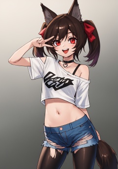 1girl, solo, wolf ears, brown hair, long hair, twintails, bangs, hair bow, hair ribbon, red eyes, open mouth, upper teeth, smile, v, looking at viewer, shoulder cutout, off-shoulder shirt, bare shoulders, collarbone, black choker, white shirt, bra strap, choker, off shoulder, clothes writing, contrapposto, cutoffs, midriff, navel, wolf tail, black legwear, torn legwear, torn shorts, denim shorts, standing, gradient, gradient background, cowboy shot,best quality,amazing quality,very aesthetic,absurdres,
