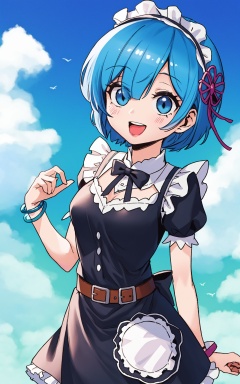 Rem\(re zero kara hajrmeru isekai seikatsu\),Maid service, blue hair, short hair,(upper body),blue sky, white cloud,belt, anklet,best quality,