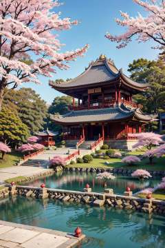 isometric chinese style architecture, tree, no humans, architecture, scenery, cherry blossoms, bridge, building, outdoors, pagoda, grass, stairs