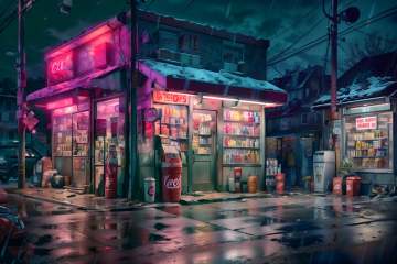 (masterpiece, best quality:1.2), ultra detailed, cinematic lighting, HDR, ilustration, corner store, rain, vending machine, no humans, night, scenery, outdoors, shop, convenience store, road, trash can, street, power lines, building, can, dark, coca-cola, sky, sign, motor vehicle, ground vehicle, utility pole, alley, lamppost, car