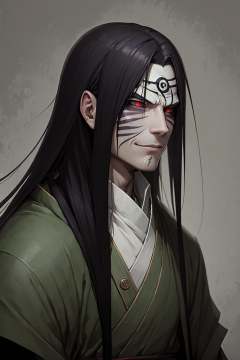 orochimaru,1boy, male focus, solo, black hair, red eyes, long hair, upper body, japanese clothes, grey background, colored sclera, facial mark
