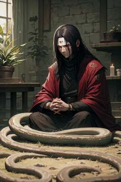 ,candle, 1boy, snake, black hair, robe, long hair, male focus, indoors, plant, solo, own hands together, red eyes, black robe, closed mouth, sitting, praying
