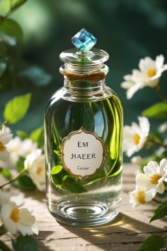 flower, artist name, blurry, english text, no humans, depth of field, blurry background, bottle, gem, jar, still life