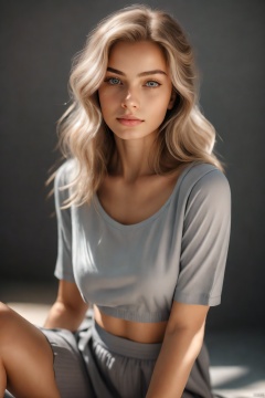 ((best quality)), (real), (masterpiece), absurdres, realistic, A beautiful woman with blonde hair, wearing a white top and gray skirt, sitting against a gray background. Her gaze is directed towards the camera, and she has a gentle smile on her face. The lighting in the photo is soft and even, highlighting her facial features and body contours. The overall style of the image is elegant and sophisticated, with a focus on natural beauty and simplicity.,<lora:EMS-284171-EMS:0.600000>,<lora:EMS-78342-EMS:0.200000>,<lora:EMS-276654-EMS:0.300000>