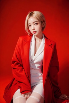 Outdoor scenery, snow view, Snow Mountain, girl, red wool coat, pretty face, short hair, blonde hair, (photo reality: 1.3), Edge lighting, (high detail skin: 1.2), 8K Ultra HD, high quality, high resolution, the best ratio of four fingers and a thumb, (photo reality: 1.3), wearing a red coat, white shirt inside, big chest, solid color background, solid red background, advanced feeling, texture full, 1 girl, Xiqing, HSZT, Xiaxue, dongy, a girl, magic eyes, black 8d smooth stockings, 1girl, (\xing he\), xiqing,<lora:EMS-284171-EMS:0.600000>