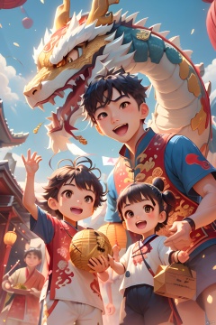 Gold coin, Paper lantern, Oriental dragon, lantern, Open your mouth., Ryuu, Children, Look at the viewer, Smile, Short hair, Brown hair, Brown eyes, Multiple children, Short sleeves, Black eyes, Outdoor, Golden color, Shorts, Black hair, Box, The sky, blue shirt,traditional costume